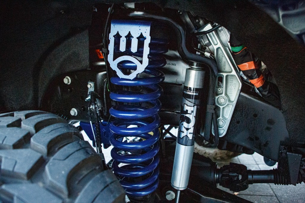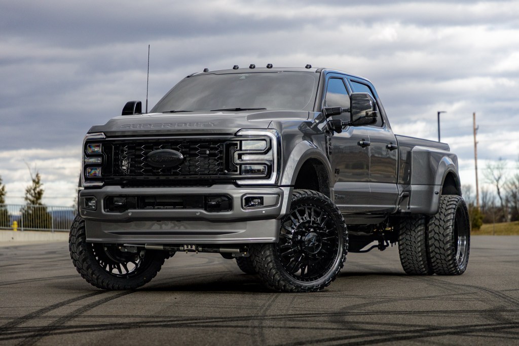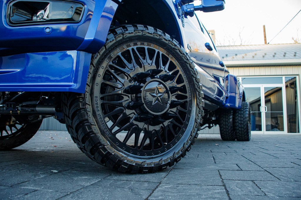 - 37″ tires and 26×8.25 wheels fit nicely with the F-450s upgraded look, with Billet spiked lug nuts or spiked caps adding a finishing touch to the vehicle’s aggressive appearance.